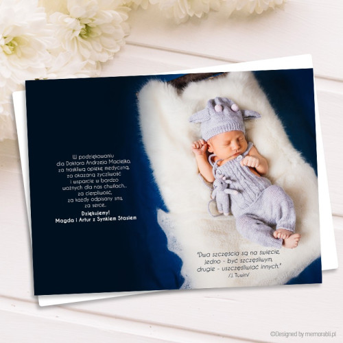 Podziękowanie dla lekarza / położnej ze zdjęciem dziecka niebieskie