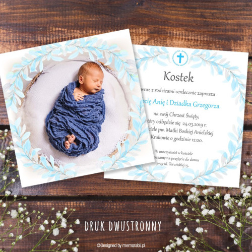 Gałązki błękitne ze zdjęciem- zaproszenie na chrzest