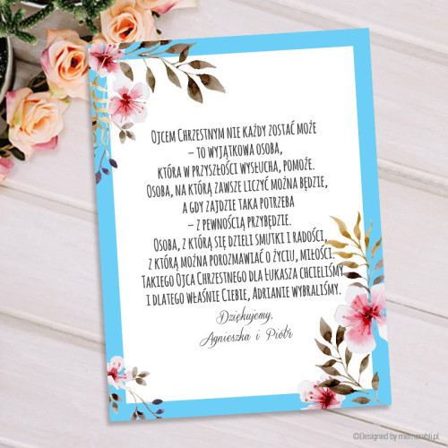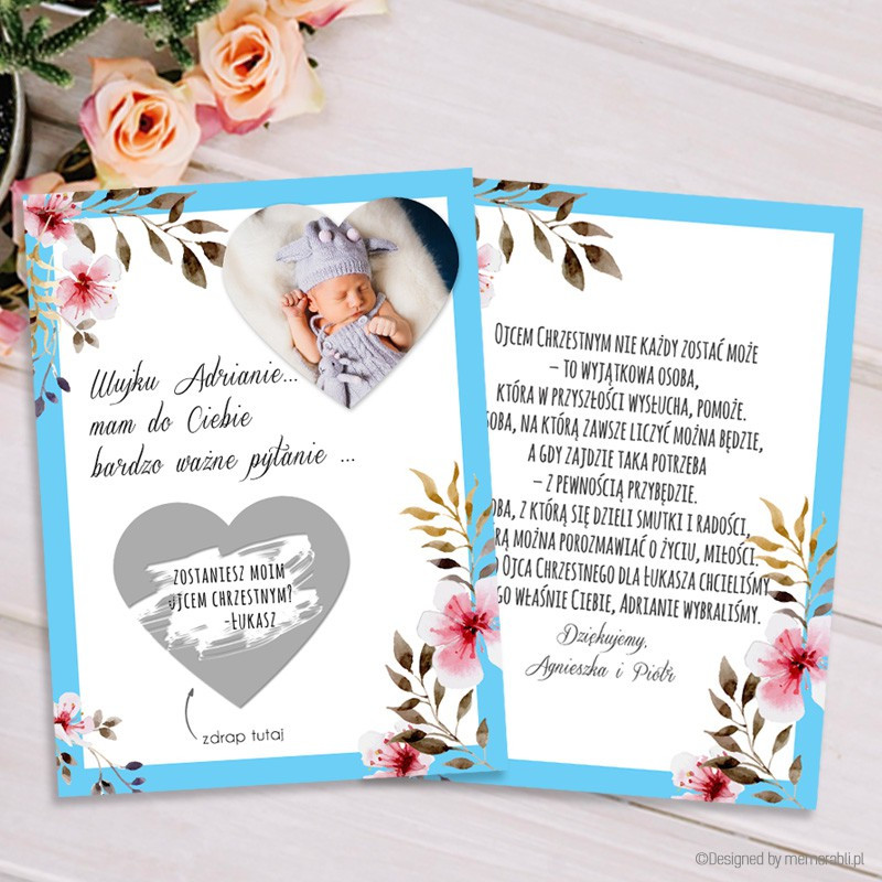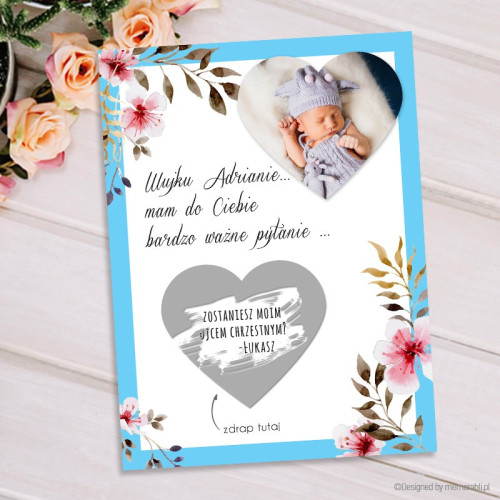 Zostaniesz rodzicem chrzestnym - ramka błękitna z kwiatami - kartka zdrapka