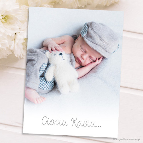 W projekcie tym możesz zmienić kolor elementów dekoracyjnych. Jest możliwość dopasowania kolorystyki kartki do przesłanego przez Ciebie zdjęcia dziecka. Na odwrocie zdrapka w kształcie serca - szara.