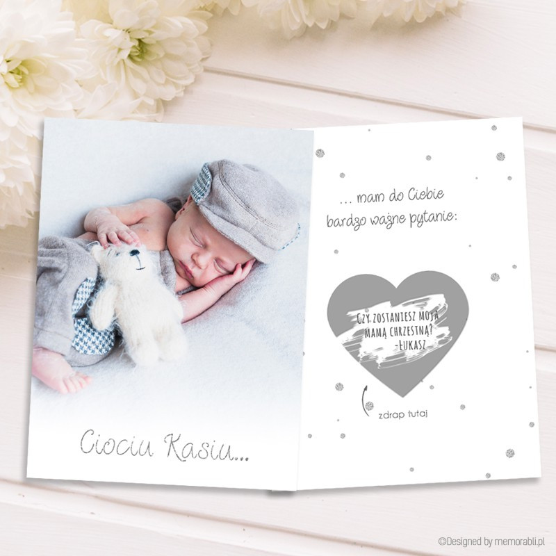 Ciociu czy zostaniesz moją mamą chrzestną? Wujku czy zostaniesz moim tatą chrzestnym? Spersonalizowane kartki ze zdrapką będą bardzo miłą niespodzianką dla przyszłego rodzica chrzestnego.