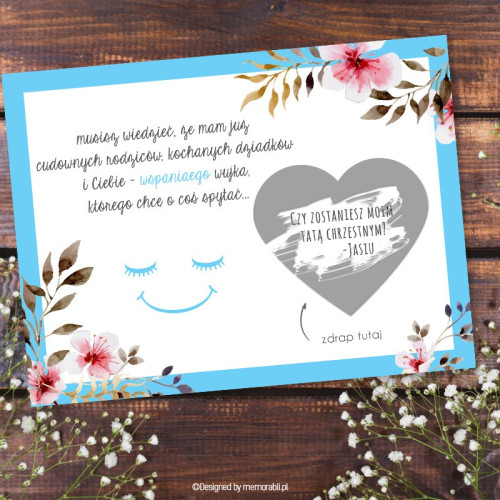 Zostaniesz rodzicem chrzestnym - ramka błękitna z kwiatami - kartka zdrapka