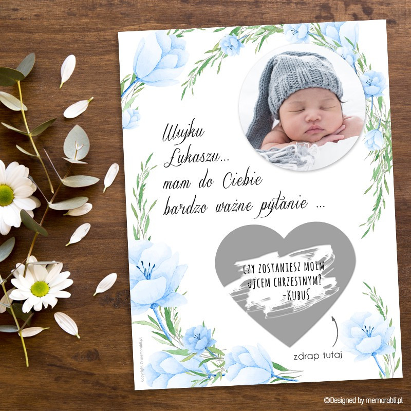 Ciociu czy zostaniesz moją mamą chrzestną? Wujku czy zostaniesz moim tatą chrzestnym? Spersonalizowane kartki ze zdrapką będą bardzo miłą niespodzianką dla przyszłego rodzica chrzestnego.