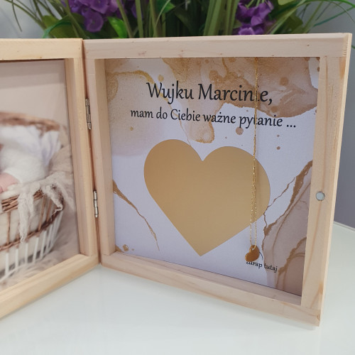 Ciociu czy zostaniesz moją mamą chrzestną? Wujku czy zostaniesz moim tatą chrzestnym? Spersonalizowane pudełeczko ze zdjęciem Twojego dziecka oraz zdrapką. Pod zdrapką ukryte ważne pytanie. Złote serduszko dodaje elegancji, dodatkowo można od razu nim sprawdzić co zostało ukryte pod zdrapką.