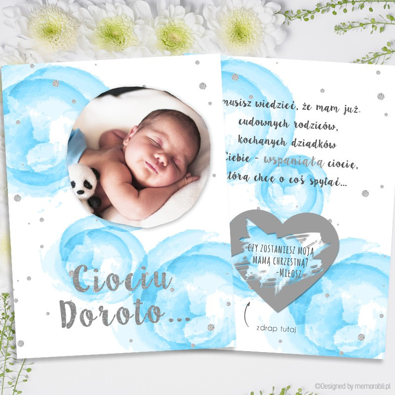 Ciociu czy zostaniesz moją mamą chrzestną? Wujku czy zostaniesz moim tatą chrzestnym? Spersonalizowane kartki ze zdrapką będą bardzo miłą niespodzianką dla przyszłego rodzica chrzestnego.