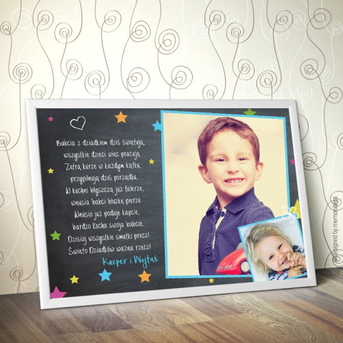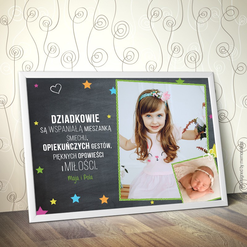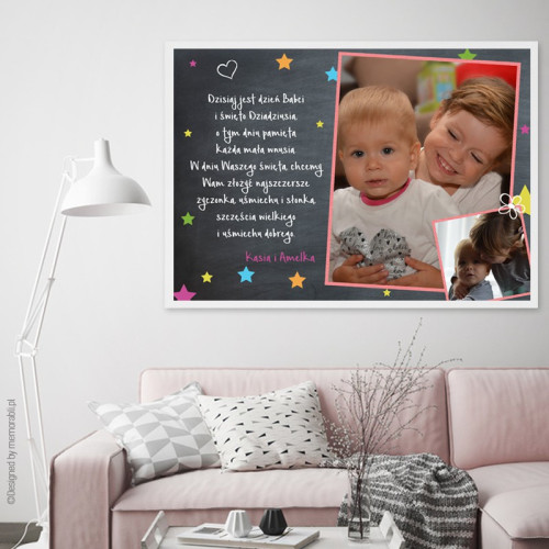 Spersonalizowany plakat dla babci i dziadka to oryginalny pomysł na prezent z okazji ich święta. Warto pamiętać o tym dniu, aby podziękować za ich miłość, obecność i pomoc. Na plakacie zostaną umieszczone Twoje zdjęcia.