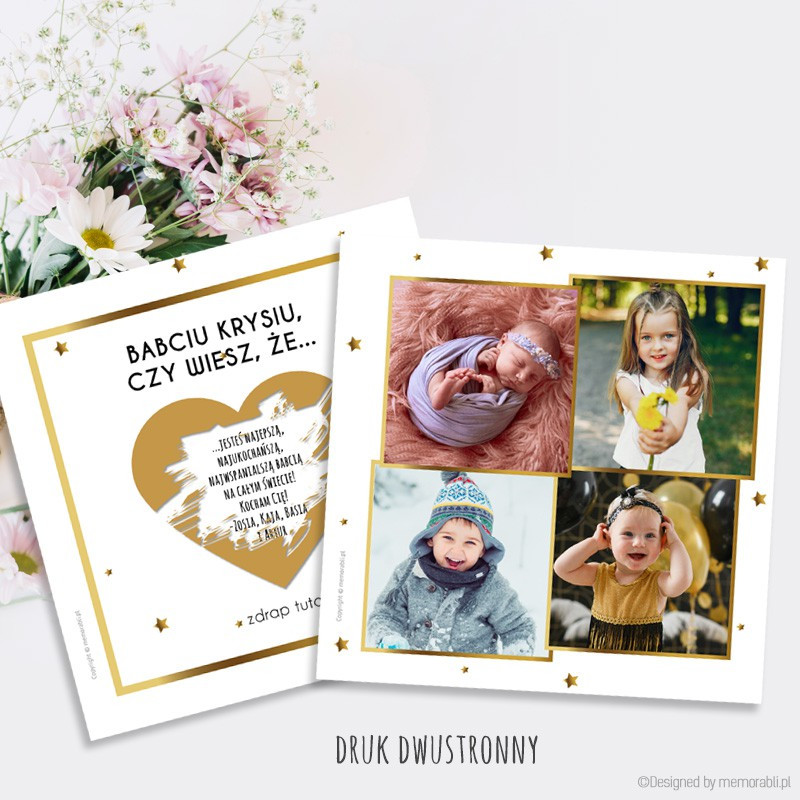 Spersonalizowana kartka ZDRAPKA dla babci i/lub dziadka to oryginalny pomysł na upominek z okazji ich święta lub dodatek do przygotowanego większego prezentu! Na kartce zostaną umieszczone przesłane przez Ciebie zdjęcia, a pod zdrapką ukryty dowolny tekst - może być to wierszyk, sentencja lub życzenia płynące prosto z serca wnuków.