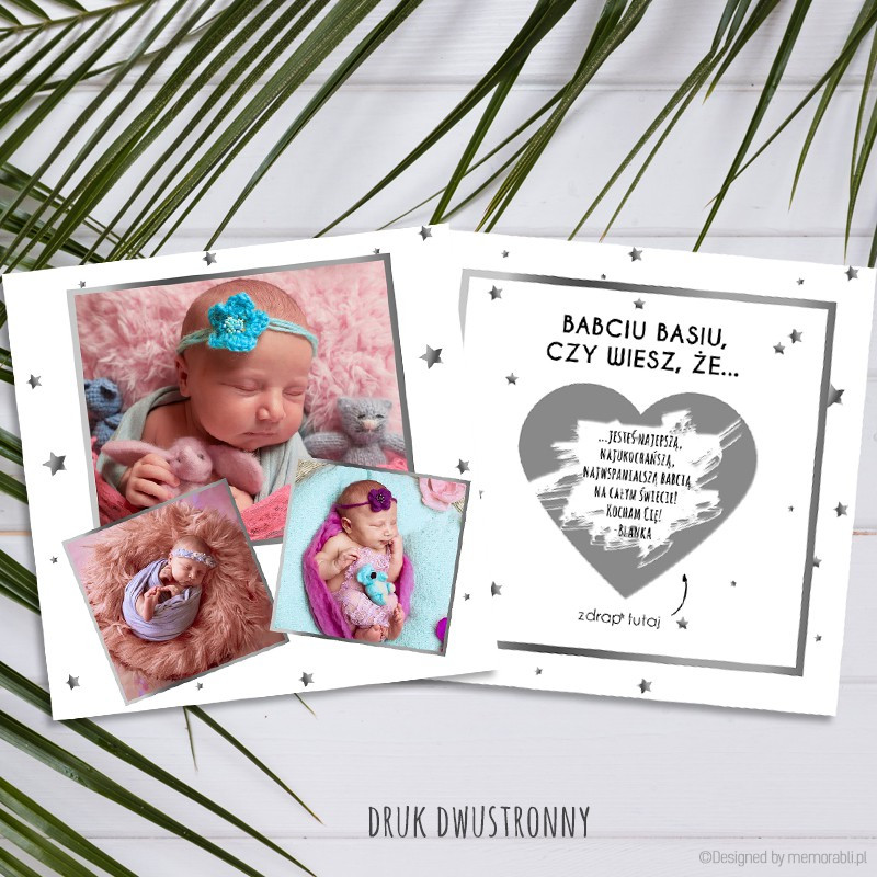 Spersonalizowana kartka ZDRAPKA dla babci i/lub dziadka to oryginalny pomysł na upominek z okazji ich święta lub dodatek do przygotowanego większego prezentu! Na kartce zostaną umieszczone przesłane przez Ciebie zdjęcia, a pod zdrapką ukryty dowolny tekst - może być to wierszyk, sentencja lub życzenia płynące prosto z serca wnuków.