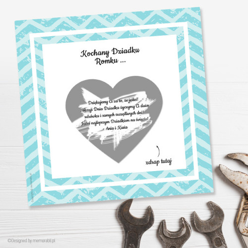 Spersonalizowana kartka ZDRAPKA dla dziadka to oryginalny pomysł na upominek z okazji jego święta lub dodatek do przygotowanego większego prezentu! Pod zdrapką zostanie ukryty dowolny tekst - może być to wierszyk, sentencja lub życzenia płynące prosto z serca wnuków.