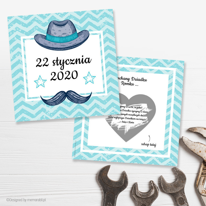 Wąsy z kapeluszem - kartka zdrapka dla dziadka