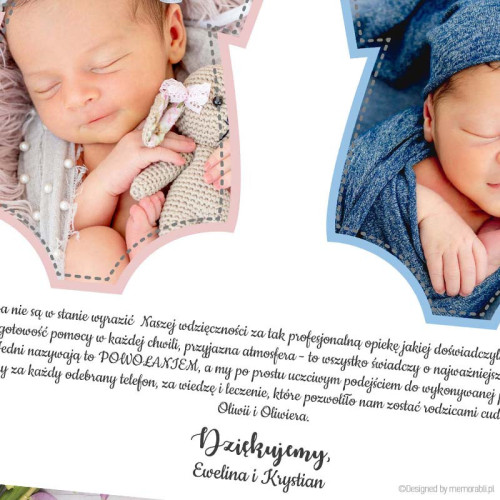 Prezentowana grafika jest w pełni personalizowalna! Oznacza to, że na wydruku znajdą się podane przez Ciebie informacje oraz zdjęcia Twoich dzieci (prześlij 2 zdjęcia). W zależności od płci dzieci plakat może być w kolorach różowy, niebieski lub szary.
