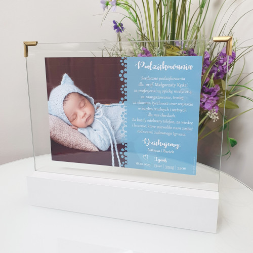 Podziękowanie dla lekarza / położnej ze zdjęciem dziecka niebieskie