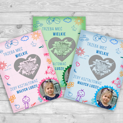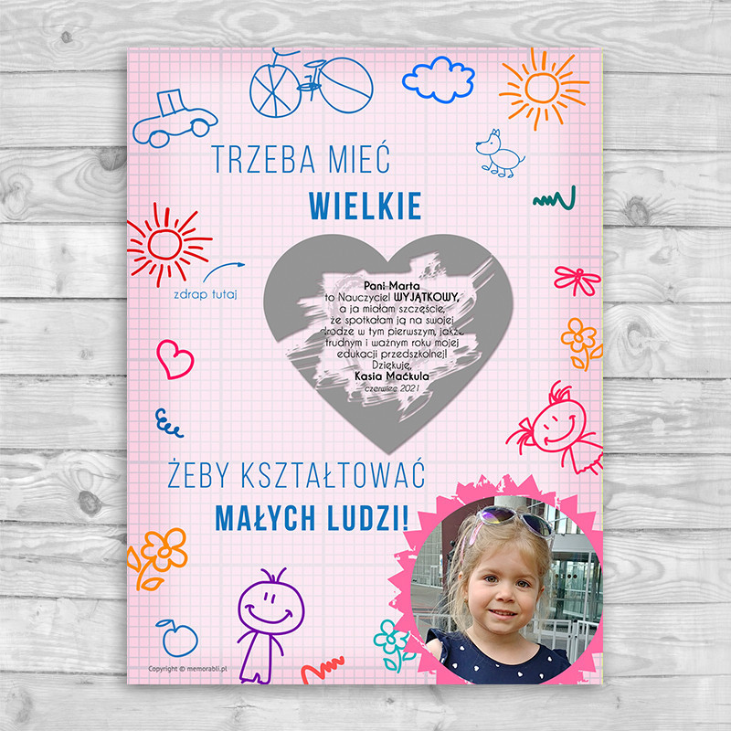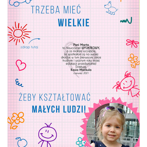 Zaskocz nauczyciela spersonalizowaną kartką zdrapką ze zdjęciem Twojego dziecka. Idealna zarówno z okazji Dnia Nauczyciela jak i na zakończenie roku szkolnego. Pod zdrapką możemy umieścić twój tekst.
