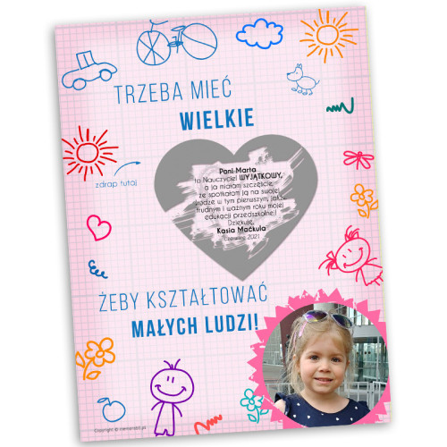 Kartka dla nauczyciela Wielkie serce różowa Zdjęcie dziecka - Kartka Zdrapka