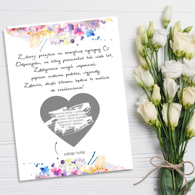 Spraw nowo upieczonemu emerytowi pożegnalną pamiątkę i stwórz spersonalizowaną kartkę zdrapkę, by mógł milo wspominać chwile wspólnie przepracowanych lat.
