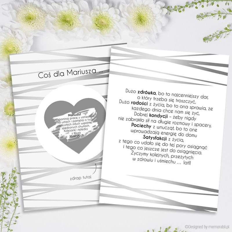 Spraw nowo upieczonemu emerytowi pożegnalną pamiątkę i stwórz spersonalizowaną kartkę zdrapkę, by mógł milo wspominać chwile wspólnie przepracowanych lat.