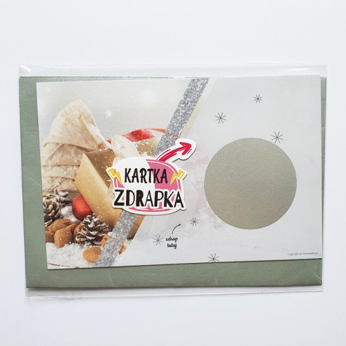 Kartka zapakowana w woreczek celofanowy, na odwrocie znajduje się ulotka z informacją co ukryte zostało pod zdrapką.