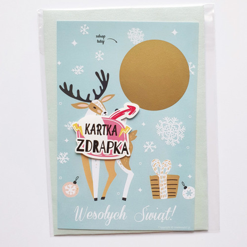 Kartka zapakowana w woreczek celofanowy, na odwrocie znajduje się ulotka z informacją co ukryte zostało pod zdrapką.