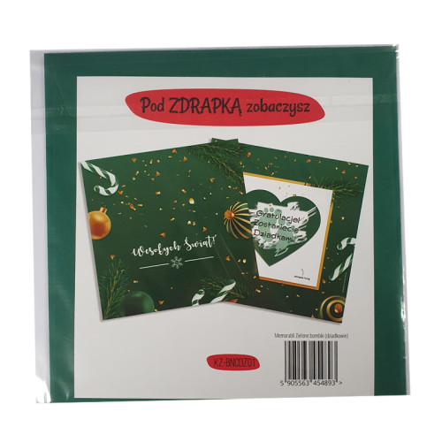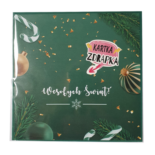 Kartka zapakowana w woreczek celofanowy, na odwrocie znajduje się ulotka z informacją co ukryte zostało pod zdrapką.