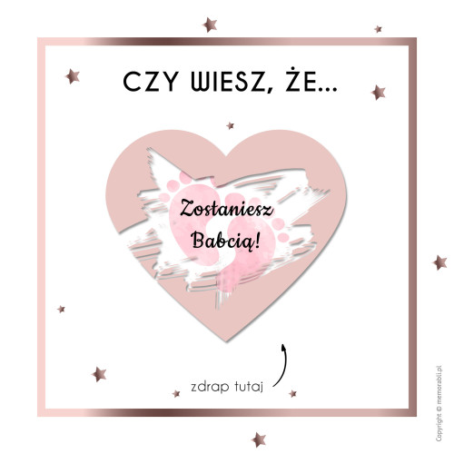 Pod zdrapką została ukryta grafika różowych stópek dziecka z napisem "Zostaniesz babcią".