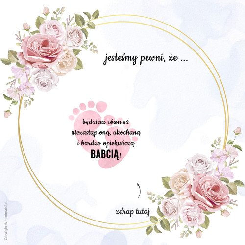 Pod zdrapką została ukryta grafika różowych stópek dziecka z napisem "będziesz również niezastąpioną, ukochaną i bardzo opiekuńczą BBABCIĄ!".
