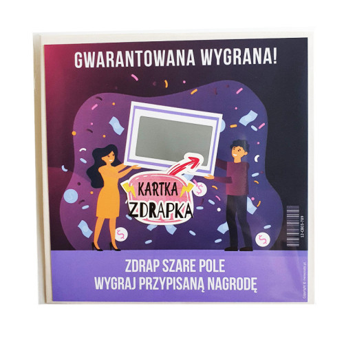 Kartka zapakowana w woreczek celofanowy, na odwrocie znajduje się ulotka z informacją co ukryte zostało pod zdrapką.