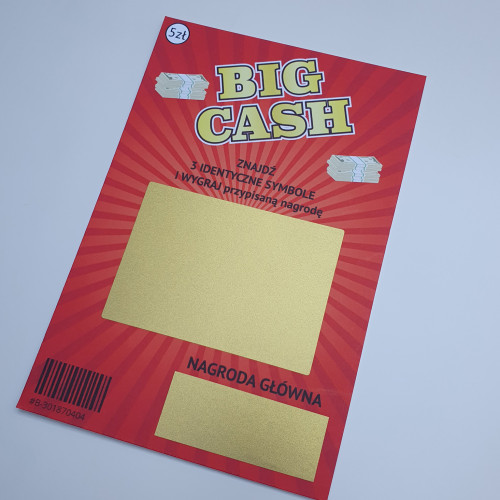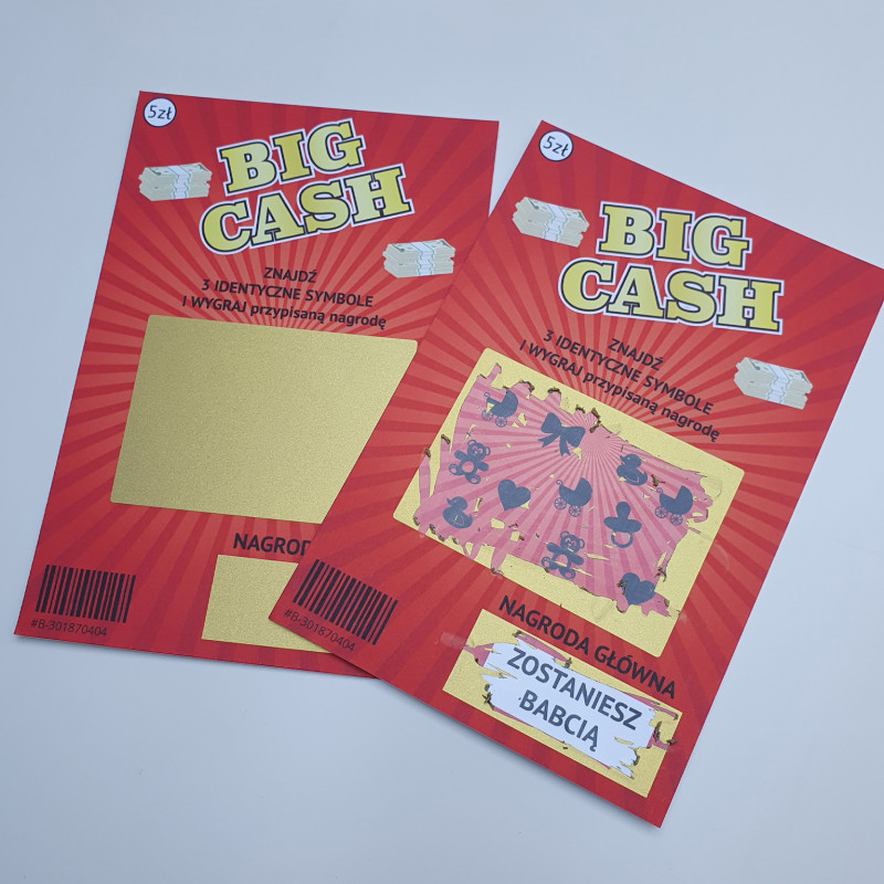 Kartka zapakowana w woreczek celofanowy, na odwrocie znajduje się ulotka z informacją co ukryte zostało pod zdrapką.