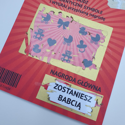 Pod zdrapką została ukryta postać wózka dziecięciego (3 razy). Nagroda główna to - Zostaniesz babcią