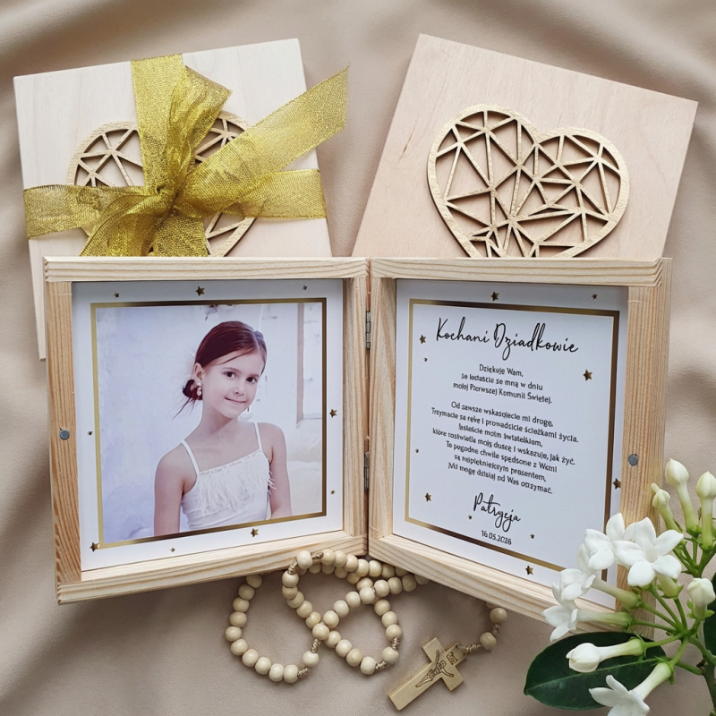 ✅ W pudełku po lewej zdjęcie dziecka, po prawej kartka z Twoim tekstem podziękowań.