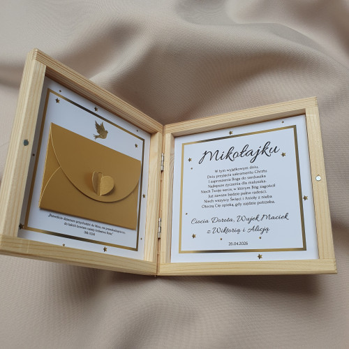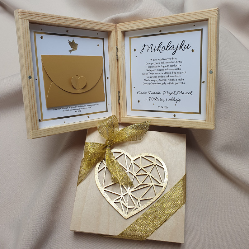 I tutaj mamy dla Ciebie świetną propozycję — drewniane, spersonalizowane pudełeczko z ukrytą złotą kopertką na pieniądze.