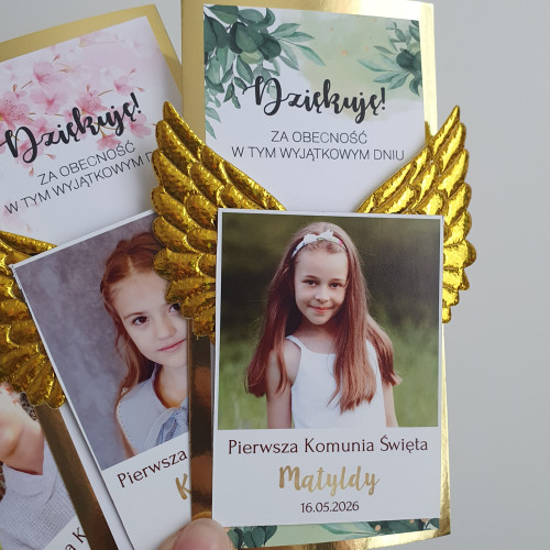 Podziękowanie dla gości Pierwsza Komunia Święta Magnes dziewczynka + złote skrzydła