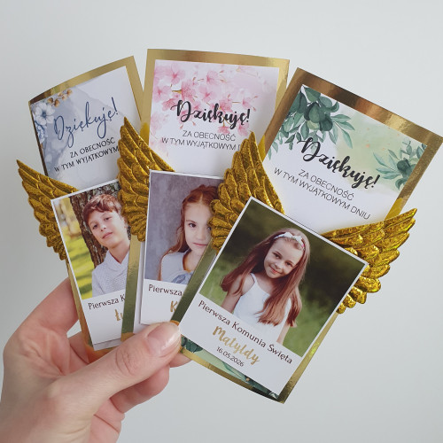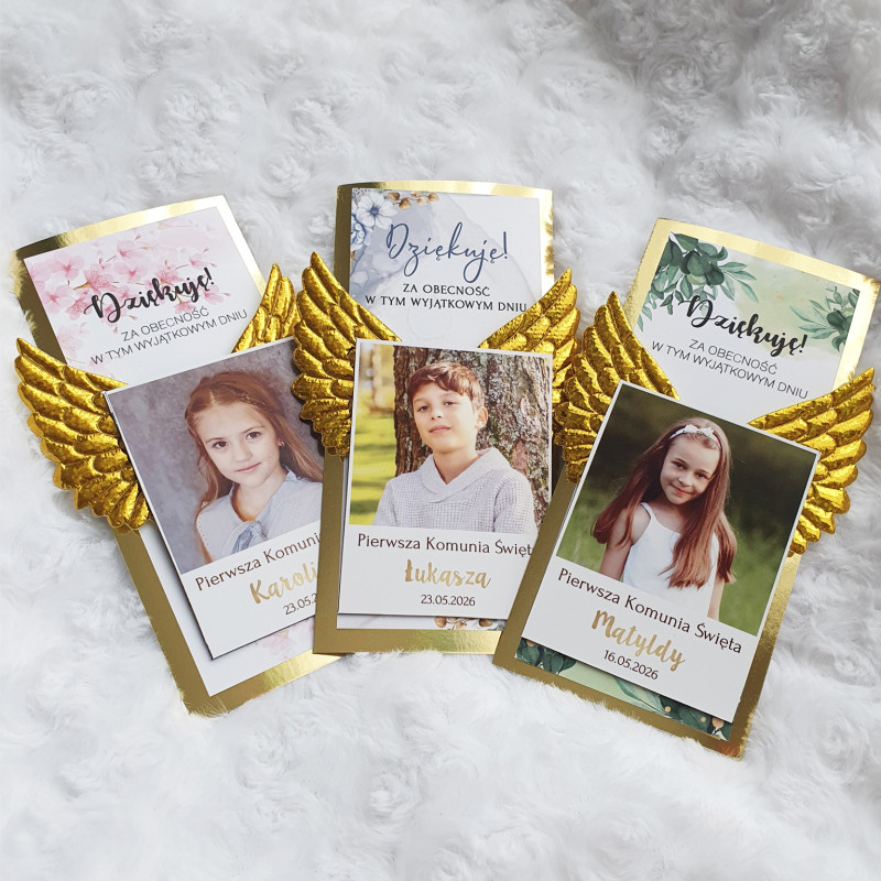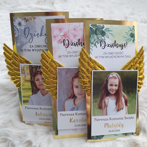 Podziękowanie dla gości Pierwsza Komunia Święta Magnes + złote skrzydła