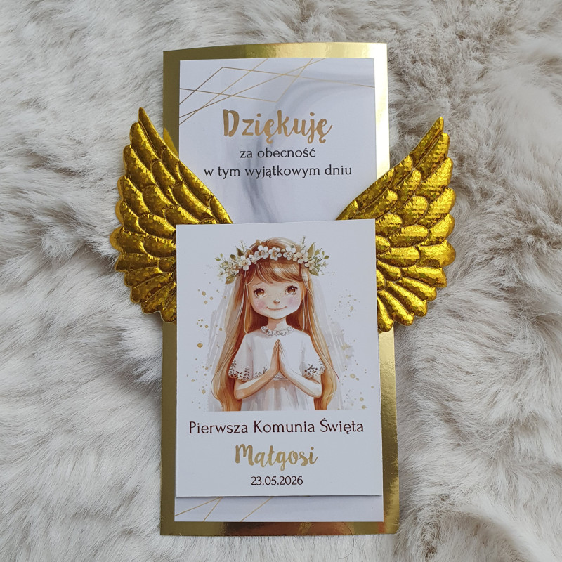 Podziękowanie dla gości Pierwsza Komunia Święta Magnes dziewczynka + złote skrzydła