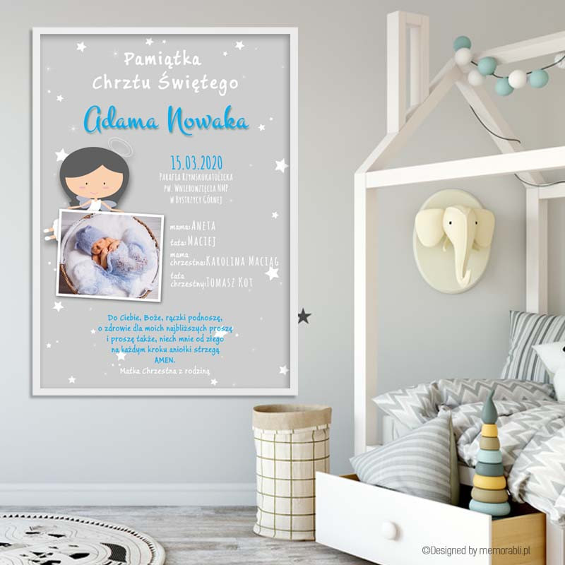 Aniołek nad zdjęciem szary z niebieskim - pamiątka Chrztu Świętego