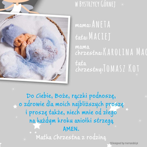 W pełni personalizowana pamiątka Chrztu Świętego ze zdjęciem maleństwa.