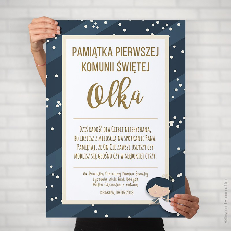 Pamiątka Pierwszej Komunii Świętej w formie plakatu - taki prezent będzie nie tylko nietuzinkowym sposobem na przekazanie życzeń, ale też piękną pamiątką po uroczystości i modną dekoracją pokoju dziecka
