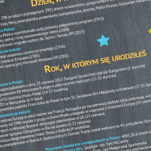 Dane metryczkowe dziecka, znaczenie imienia oraz znak zodiaku. Ponadto informacje o wydarzeniach z dnia urodzenia dziecka (w Polsce i na świecie) oraz roku (także w Polsce i na świecie). Czy to koniec? Oczywiście, że nie. Pojawiają się także takie informacje jak przeciętne miesięczne wynagrodzenie w danym roku, kto zdobył oskara za najlepszy film czy informacja o zdobywcy nagrody Nobala.