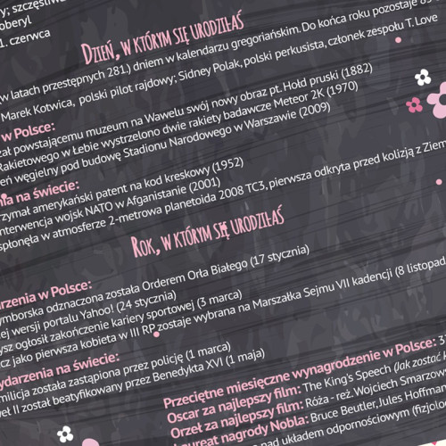 Dane metryczkowe dziecka (opcjonalne), znaczenie imienia oraz znak zodiaku. Ponadto informacje o wydarzeniach z dnia urodzenia dziecka (w Polsce i na świecie) oraz roku (także w Polsce i na świecie). Czy to koniec? Oczywiście, że nie. Pojawiają się także takie informacje jak przeciętne miesięczne wynagrodzenie w danym roku, kto zdobył oskara za najlepszy film czy informacja o zdobywcy nagrody Nobala.