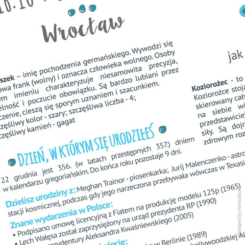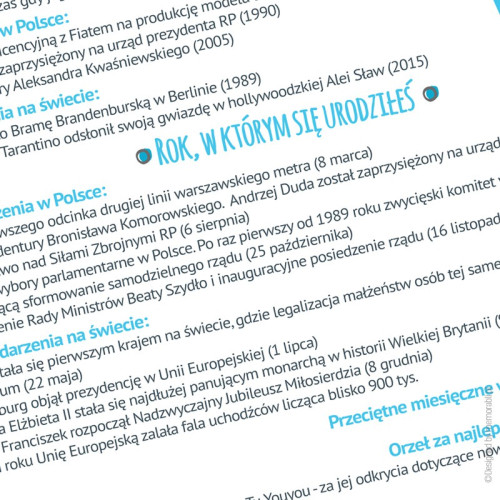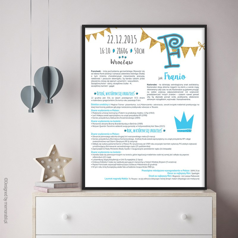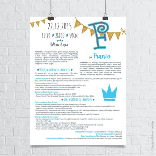 Dane metryczkowe dziecka, znaczenie imienia oraz znak zodiaku. Ponadto informacje o wydarzeniach z dnia urodzenia dziecka (w Polsce i na świecie) oraz roku (także w Polsce i na świecie). Czy to koniec? Oczywiście, że nie. Pojawiają się także takie informacje jak przeciętne miesięczne wynagrodzenie w danym roku, kto zdobył oskara za najlepszy film czy informacja o zdobywcy nagrody Nobala.