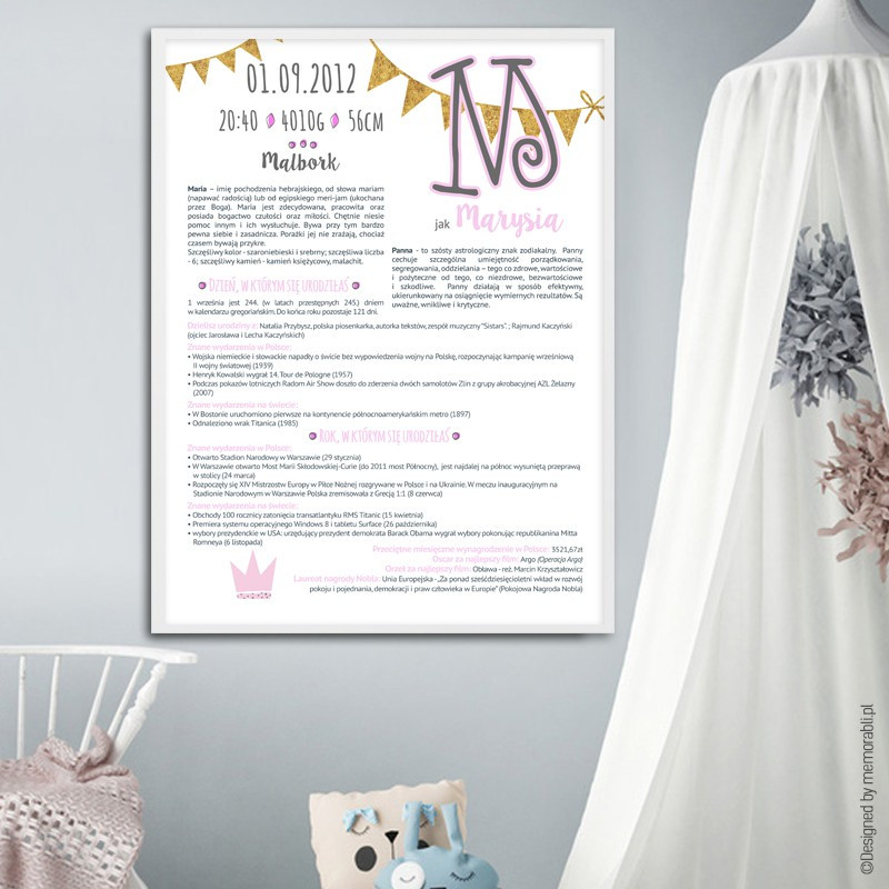 Dane metryczkowe dziecka, znaczenie imienia oraz znak zodiaku. Ponadto informacje o wydarzeniach z dnia urodzenia dziecka (w Polsce i na świecie) oraz roku (także w Polsce i na świecie). Czy to koniec? Oczywiście, że nie. Pojawiają się także takie informacje jak przeciętne miesięczne wynagrodzenie w danym roku, kto zdobył oskara za najlepszy film czy informacja o zdobywcy nagrody Nobala.