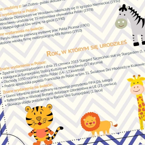 Dane metryczkowe dziecka, znaczenie imienia oraz znak zodiaku. Ponadto informacje o wydarzeniach z dnia urodzenia dziecka (w Polsce i na świecie) oraz roku (także w Polsce i na świecie). Czy to koniec? Oczywiście, że nie. Pojawiają się także takie informacje jak przeciętne miesięczne wynagrodzenie w danym roku, kto zdobył oskara za najlepszy film czy informacja o zdobywcy nagrody Nobala.