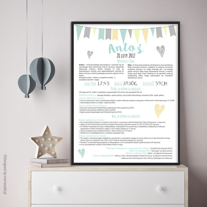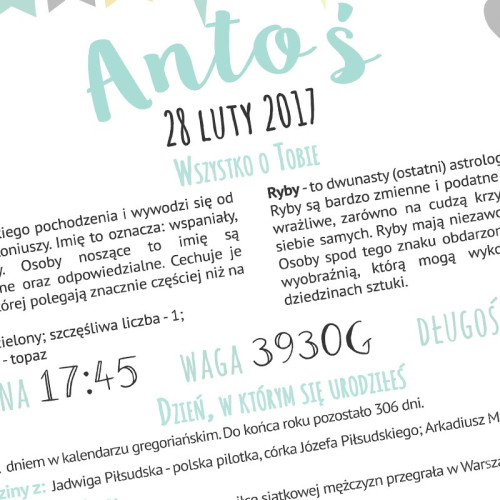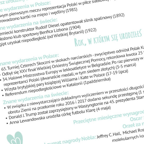 Dane metryczkowe dziecka (opcjonalne), znaczenie imienia oraz znak zodiaku. Ponadto informacje o wydarzeniach z dnia urodzenia dziecka (w Polsce i na świecie) oraz roku (także w Polsce i na świecie). Czy to koniec? Oczywiście, że nie. Pojawiają się także takie informacje jak przeciętne miesięczne wynagrodzenie w danym roku, kto zdobył oskara za najlepszy film czy informacja o zdobywcy nagrody Nobala.