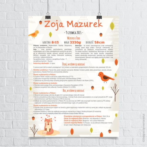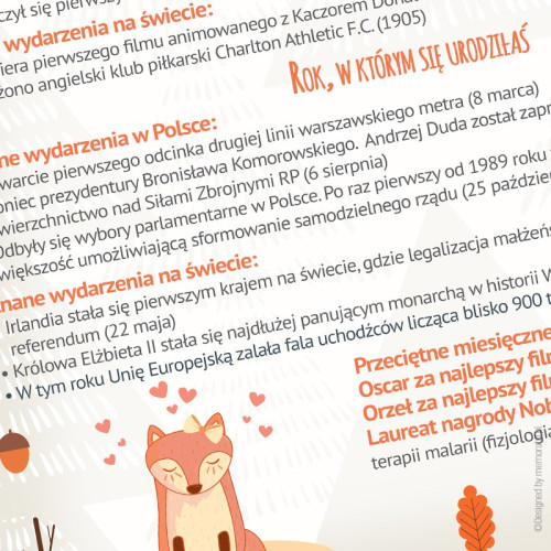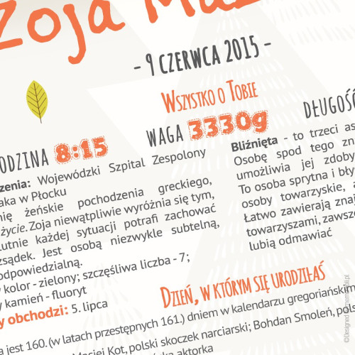 Dane metryczkowe dziecka (opcjonalne), znaczenie imienia oraz znak zodiaku. Ponadto informacje o wydarzeniach z dnia urodzenia dziecka (w Polsce i na świecie) oraz roku (także w Polsce i na świecie). Czy to koniec? Oczywiście, że nie. Pojawiają się także takie informacje jak przeciętne miesięczne wynagrodzenie w danym roku, kto zdobył Oskara za najlepszy film czy informacja o zdobywcy nagrody Nobla.
