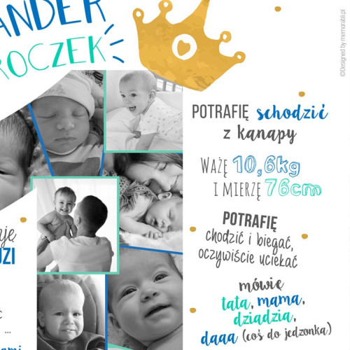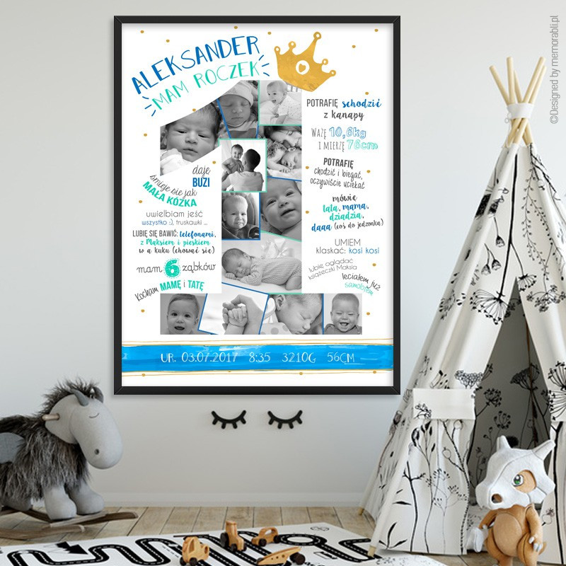 Prezentowana grafika jest w pełni personalizowalna! Oznacza to, że na wydruku znajdą się podane przez Ciebie informacje i oraz zdjęcia Twojego dziecka. Jakie dane umieścimy na plakacie? Cokolwiek chcesz, jednak aby Ci ułatwić zadanie kilka podpowiedzi znajdziesz w polu obok "DOSTOSOWYWANIE PRODUKTU". Zdjęcia do plakatu prosimy wysłać na adres email: zamowienia@memorabli.pl