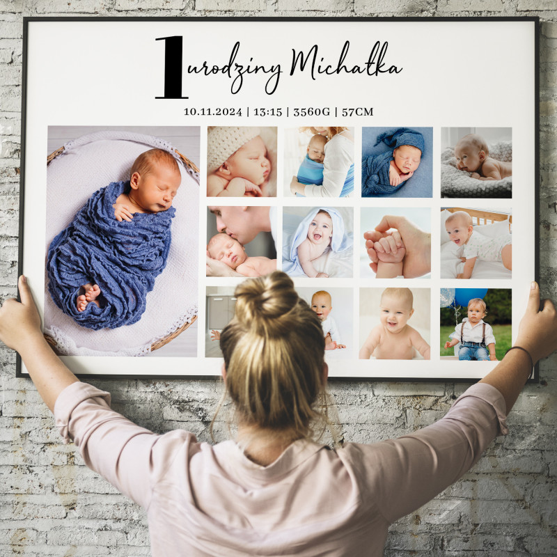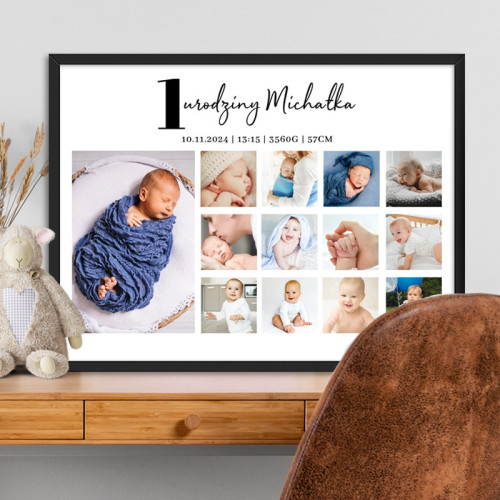 PLAKAT w formacie XXL - 50x70cm. W pełni personalizowana metryczka roczkowa ze zdjęciami Twojego dziecka. Dodatkowo zdjęcia mogą być podpisane miesiącami.