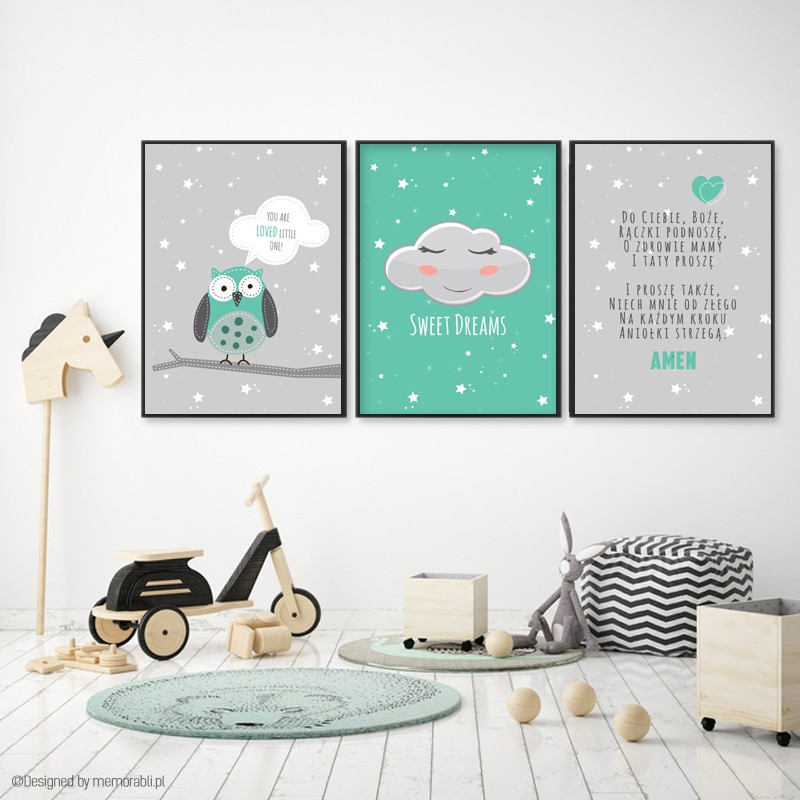 W pełni personalizowany zestaw plakatów z chmurką, sową i modlitwą - kolorystyka dowolna.