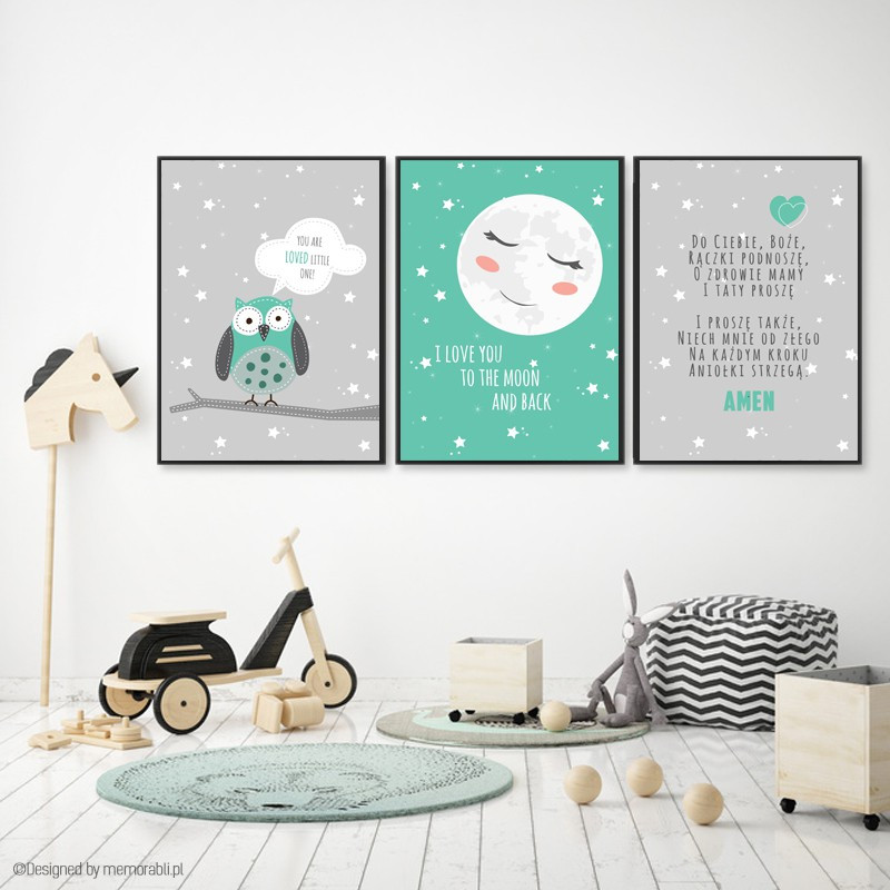 Cena 58,50 złW pełni personalizowany zestaw plakatów z chmurką, sową i modlitwą - kolorystyka dowolna.