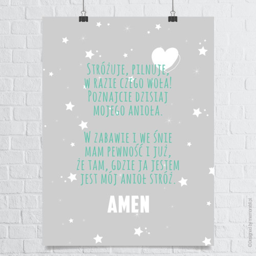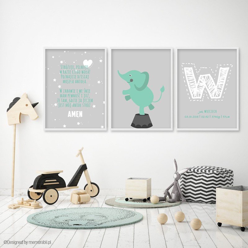 Słonik miętowo - szary - biały - metryczka + modlitwa + obrazek
