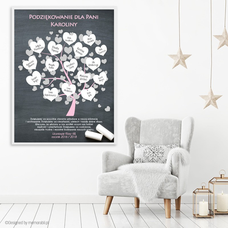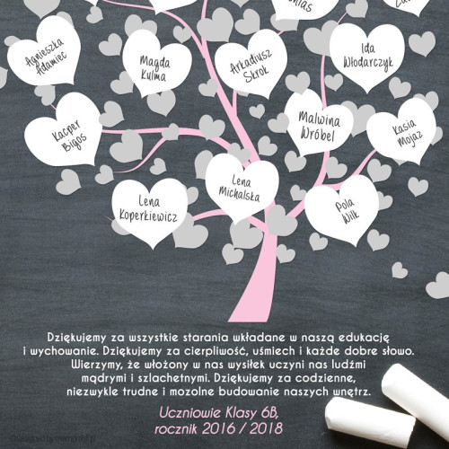 Prezentowana grafika jest w pełni personalizowalna! Oznacza to, że na wydruku znajdą się podane przez Ciebie informacje. Dzieci ze starszych klas mogą na plakacie podpisać się samodzielnie, w przyadku mniejszych podaj nam listę, a od razu zostanie umieszczona na wydruku. Na plakacie możesz zmienić kolor dekoracyjny (pień drzewa, nagłówek i podpis).