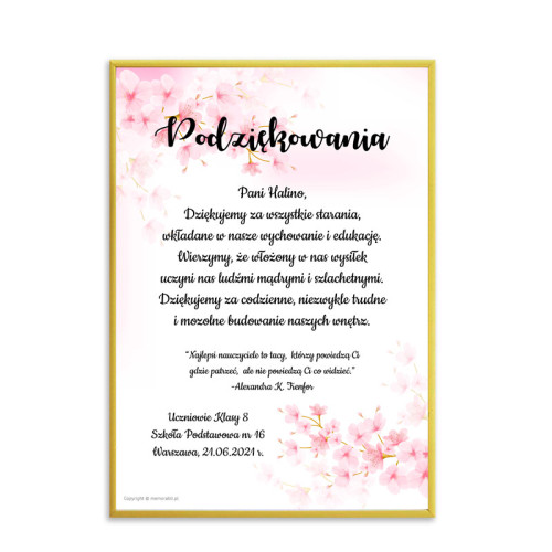 Plakat może zostać dostosowany (treść oraz data) do okazji, podczas której zostanie wręczony (dzień nauczyciela, zakończenie roku szkolnego lub inna).